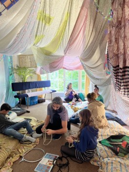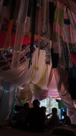 On en profite pour se rencontrer, en continuant à fabriquer ensemble cette tente-patchwork... toutes les activités manuelles nécessaires à la fabrication et à l'augmentation de la tente, nouer, tresser, coudre crocheter, mateloter... mais aussi celle de la lecture, de la discussion, de l'échange.
