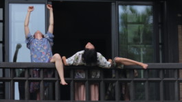 Sur le balcon de la maison du Fruit intégral, trois femmes déploient une étrange chorégraphie où mouvements arrêtés et immobilités viennent convoquer l’imaginaire d’un tableau vivant.